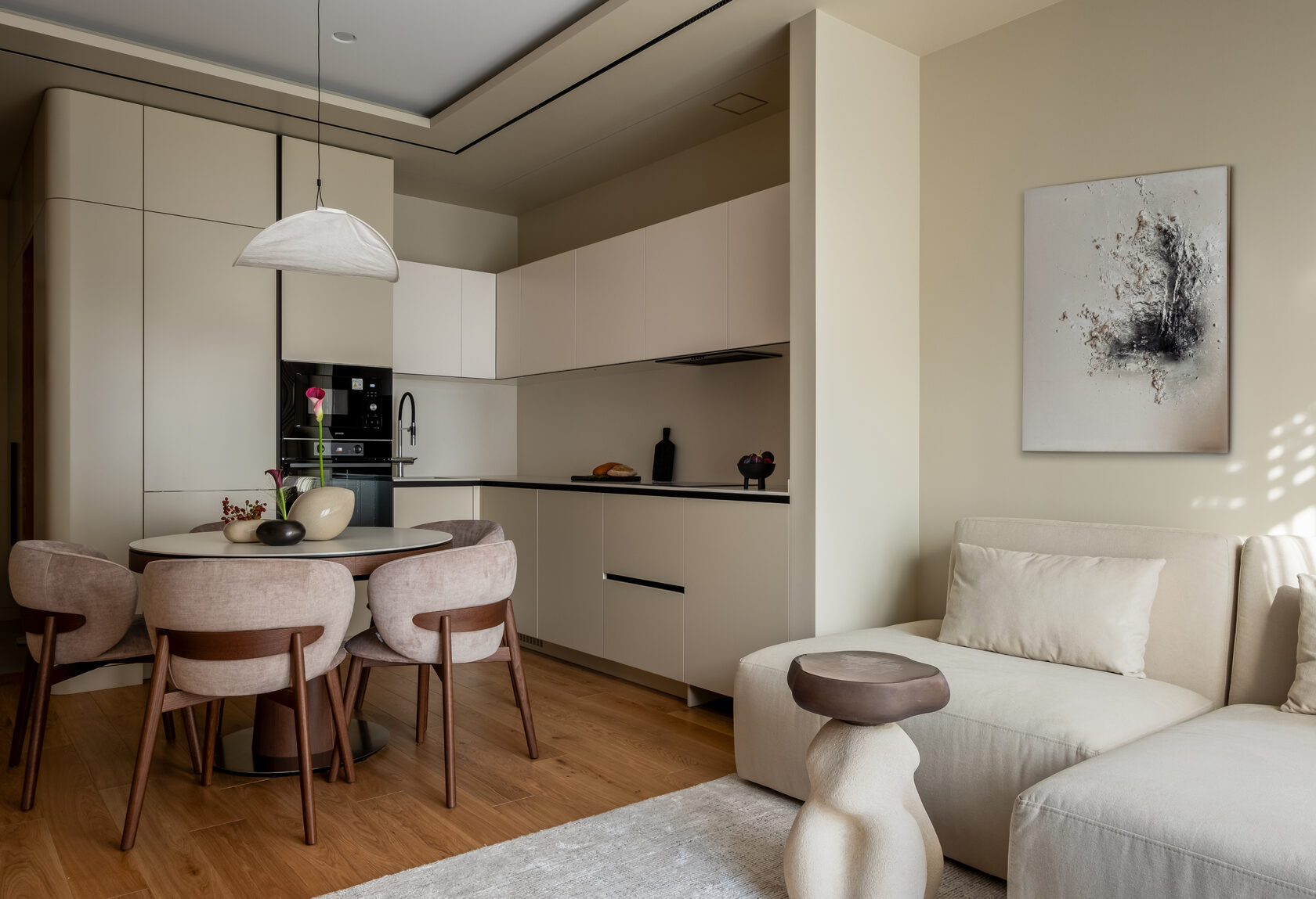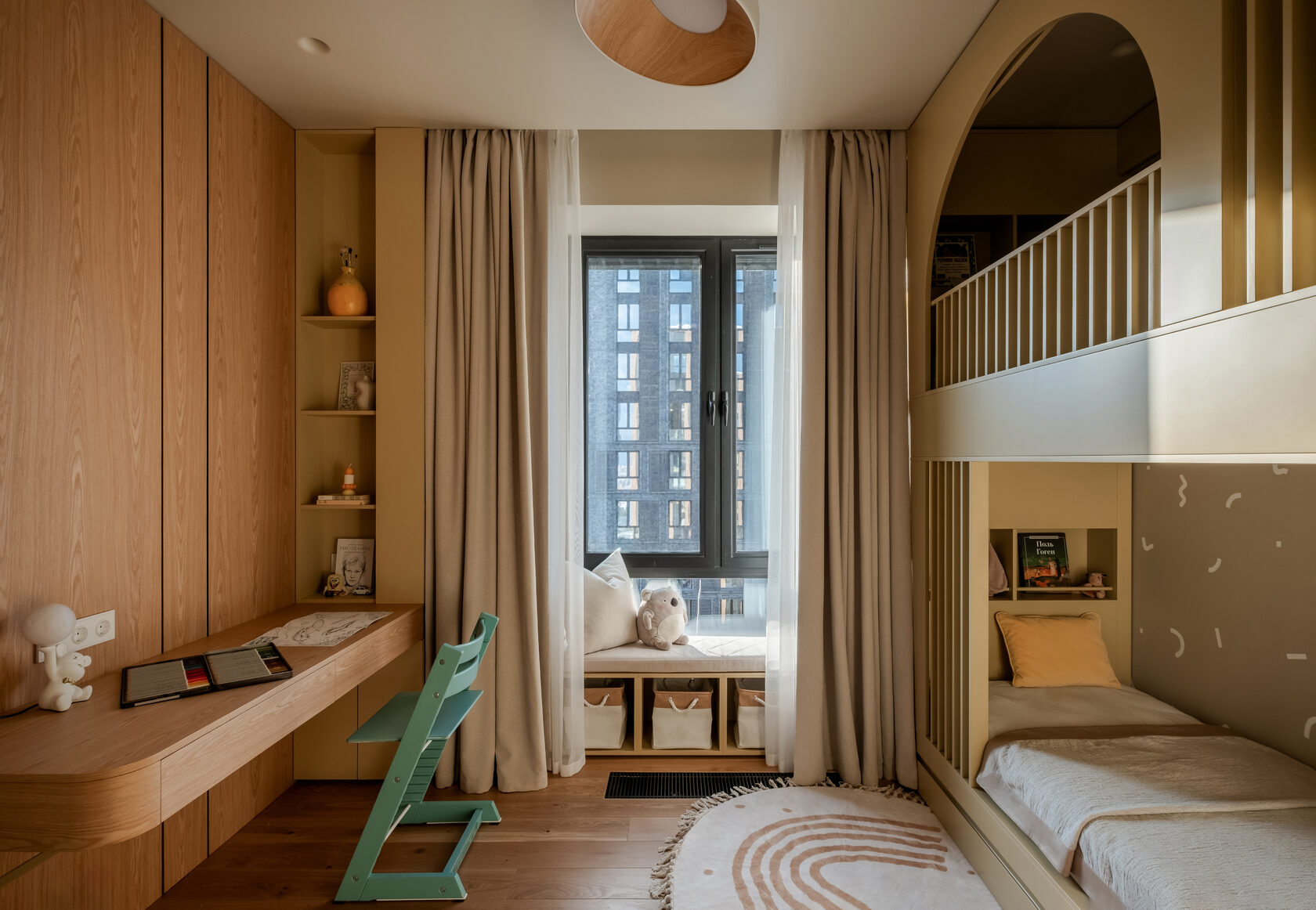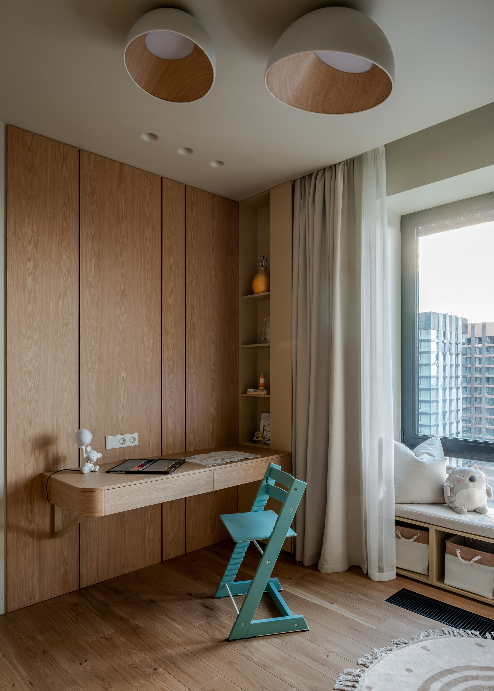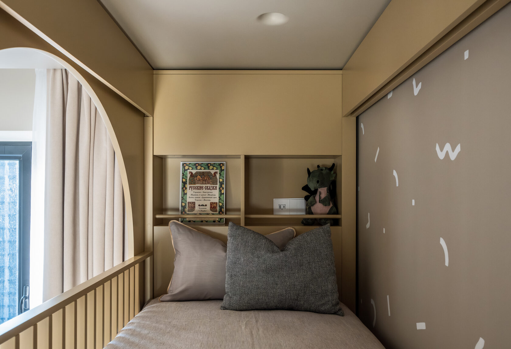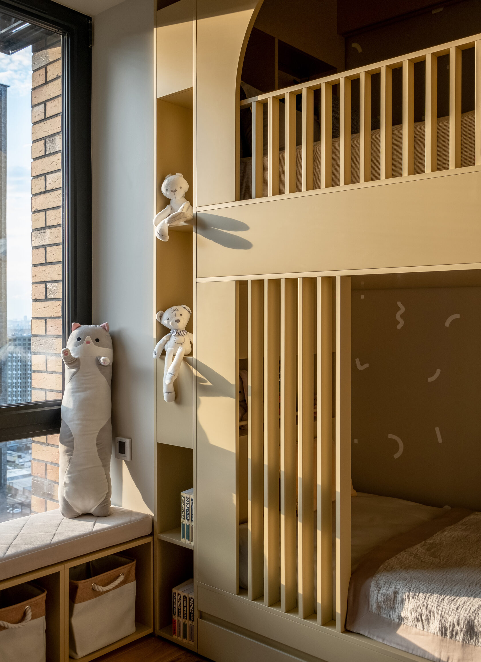 Представленный интерьер спроектирован с учетом потребностей семьи, состоящей из пяти человек: бабушки, родителей и разнополых детей. Этот ансамбль должен не только обеспечивать комфорт, но и создавать атмосферу уюта и тепла, что и достигается благодаря современному стилю оформления, преимущественно выполненному в мягких бежевых тонах. Такие оттенки наполняют пространство светом и спокойствием, вызывая желание проводить время вместе, общаться и делиться моментами друг с другом.