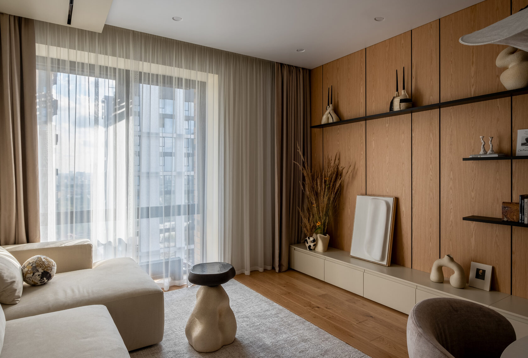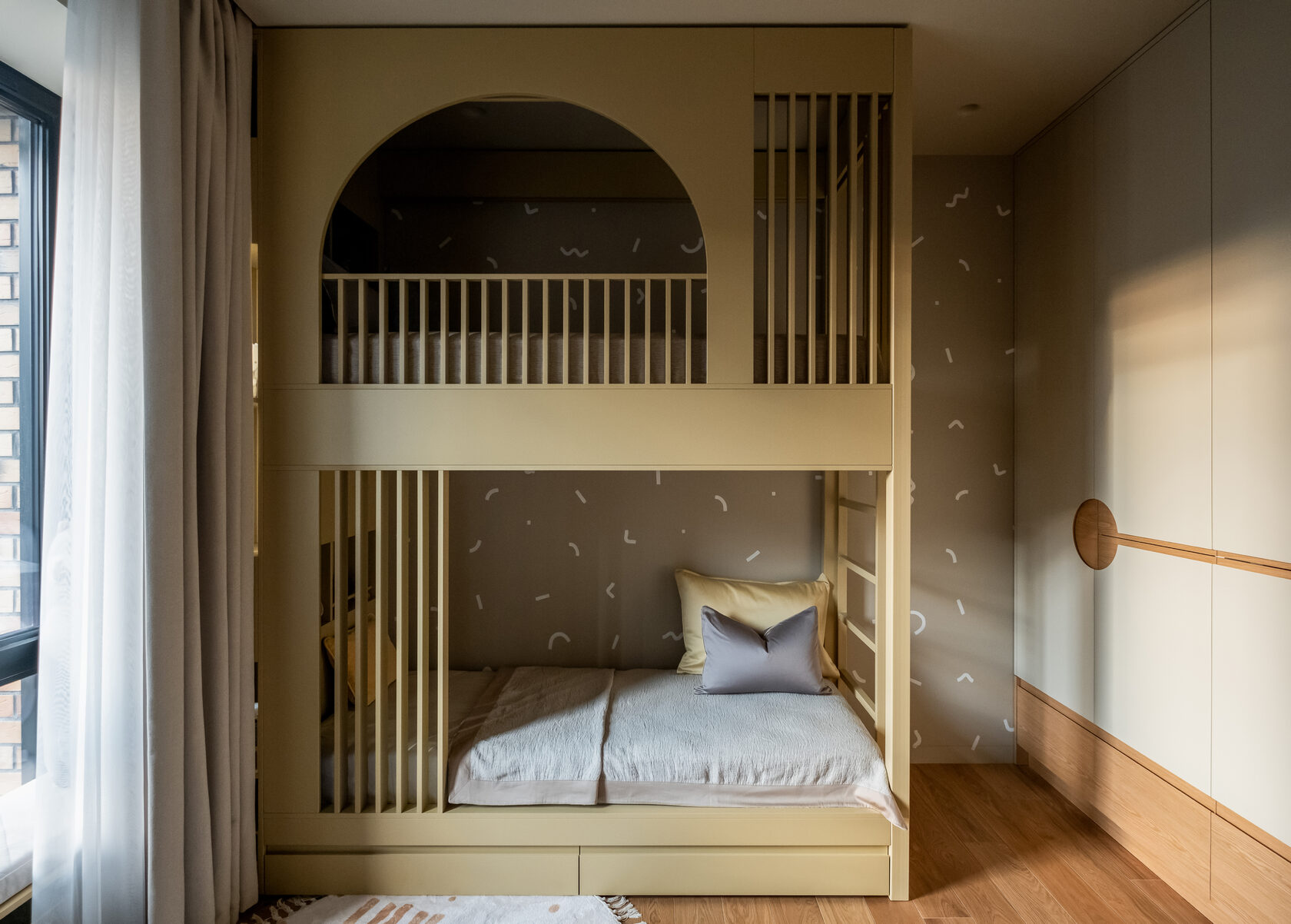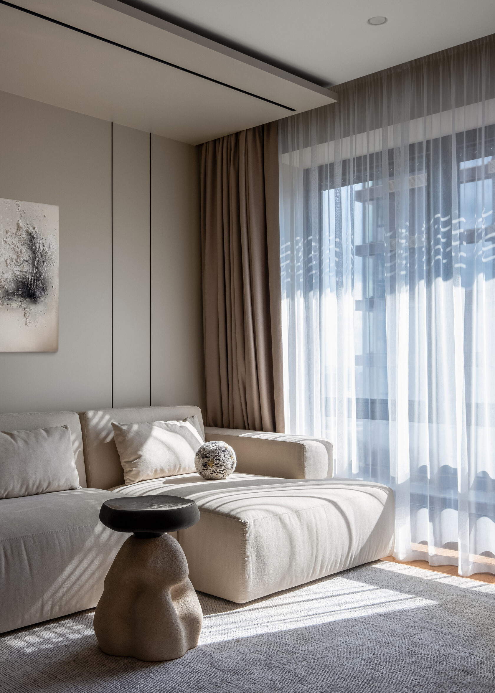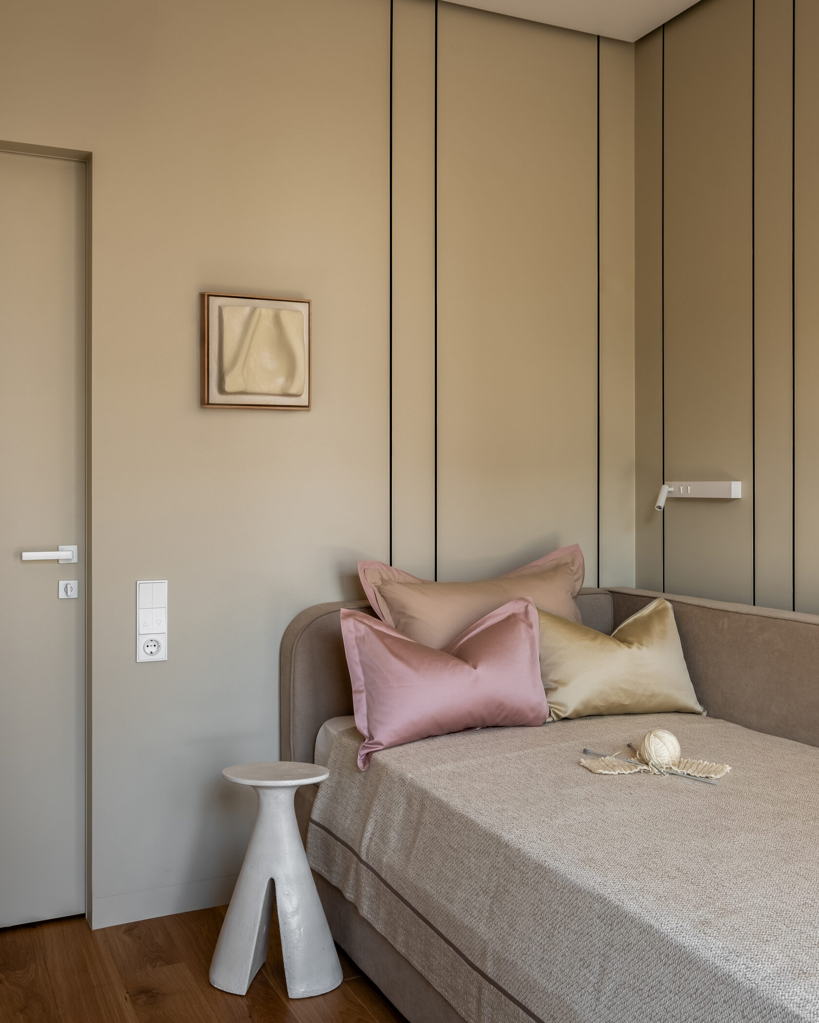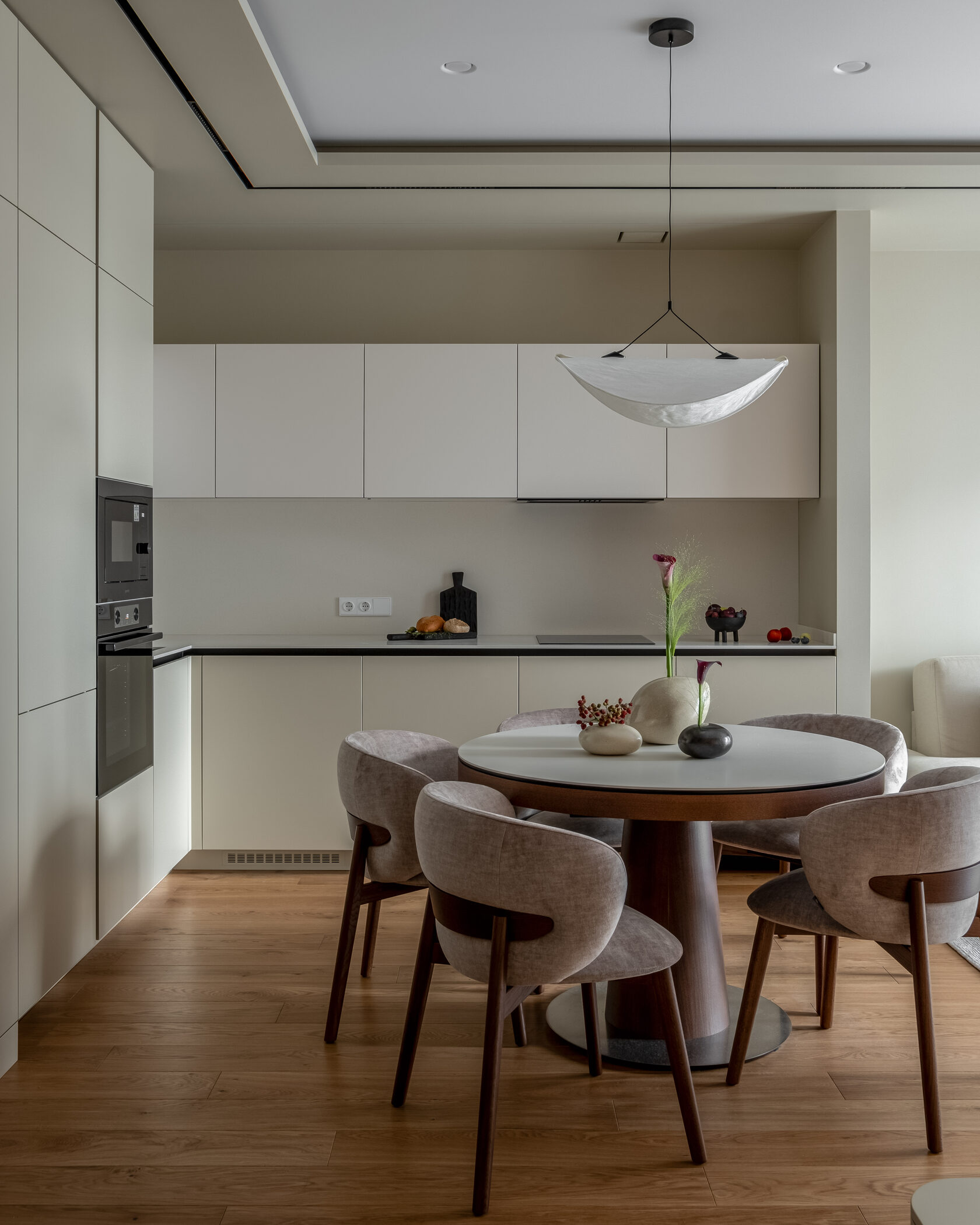 Представленный интерьер спроектирован с учетом потребностей семьи, состоящей из пяти человек: бабушки, родителей и разнополых детей. Этот ансамбль должен не только обеспечивать комфорт, но и создавать атмосферу уюта и тепла, что и достигается благодаря современному стилю оформления, преимущественно выполненному в мягких бежевых тонах. Такие оттенки наполняют пространство светом и спокойствием, вызывая желание проводить время вместе, общаться и делиться моментами друг с другом.