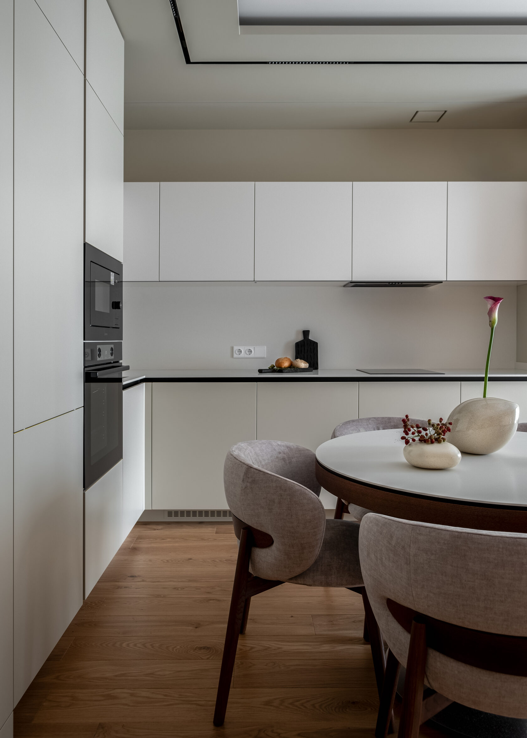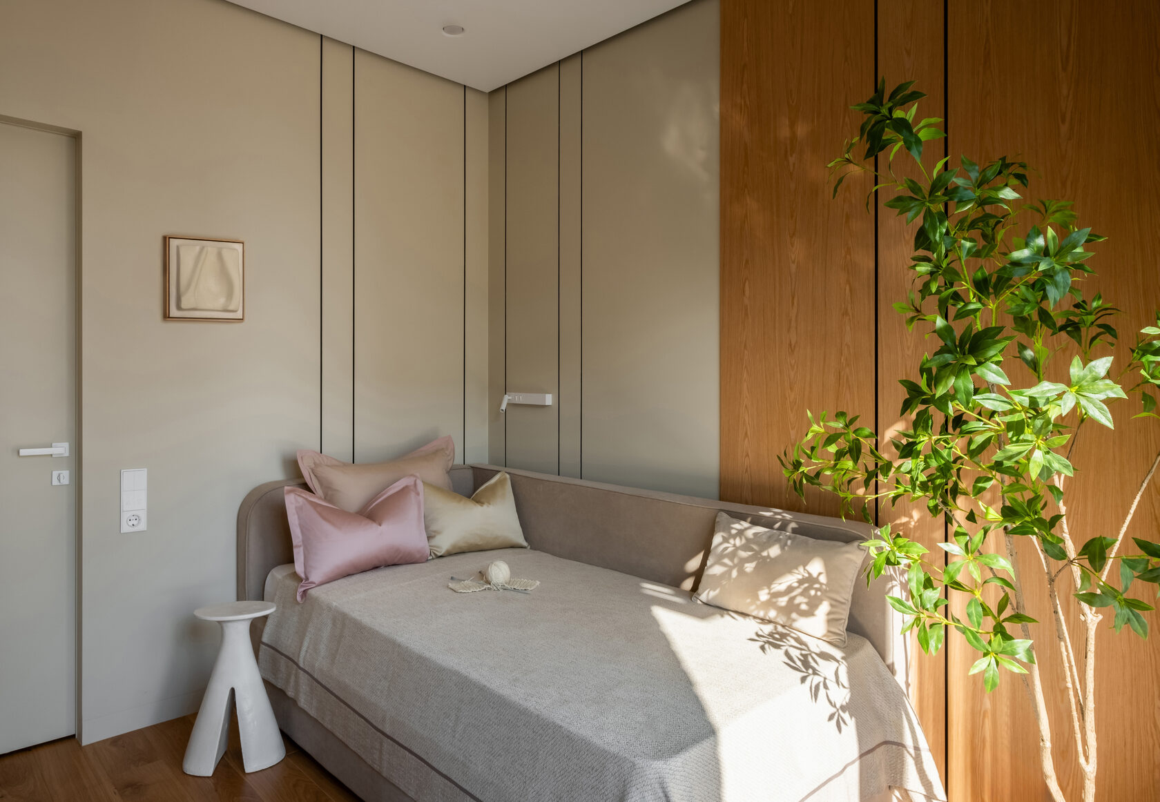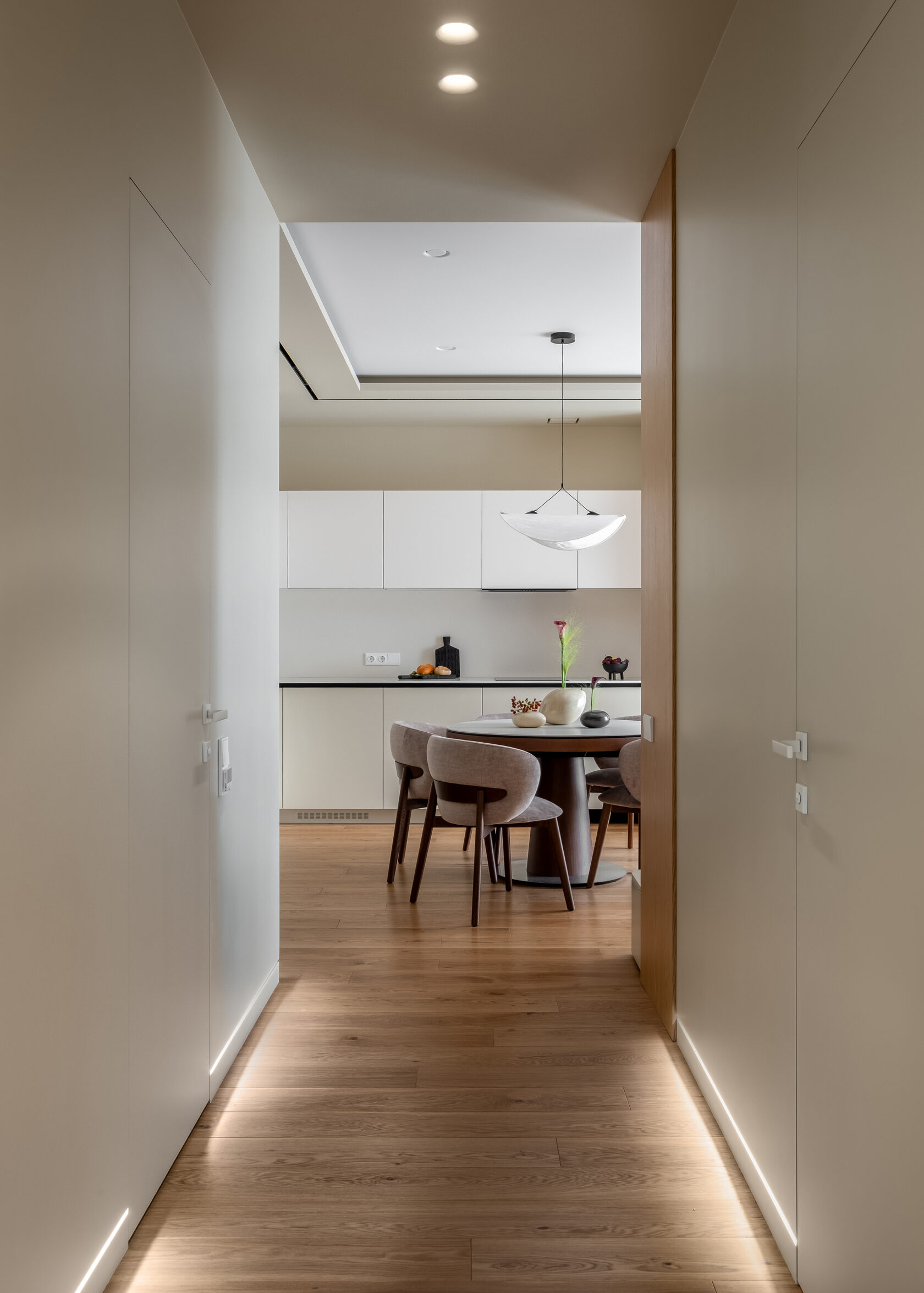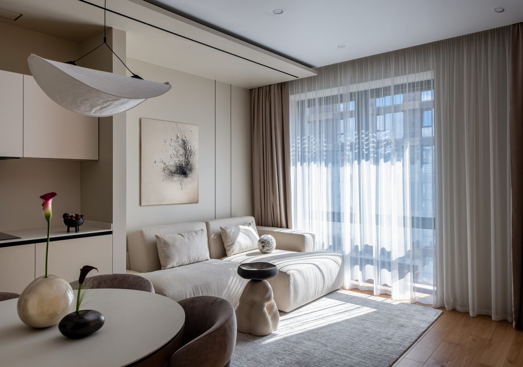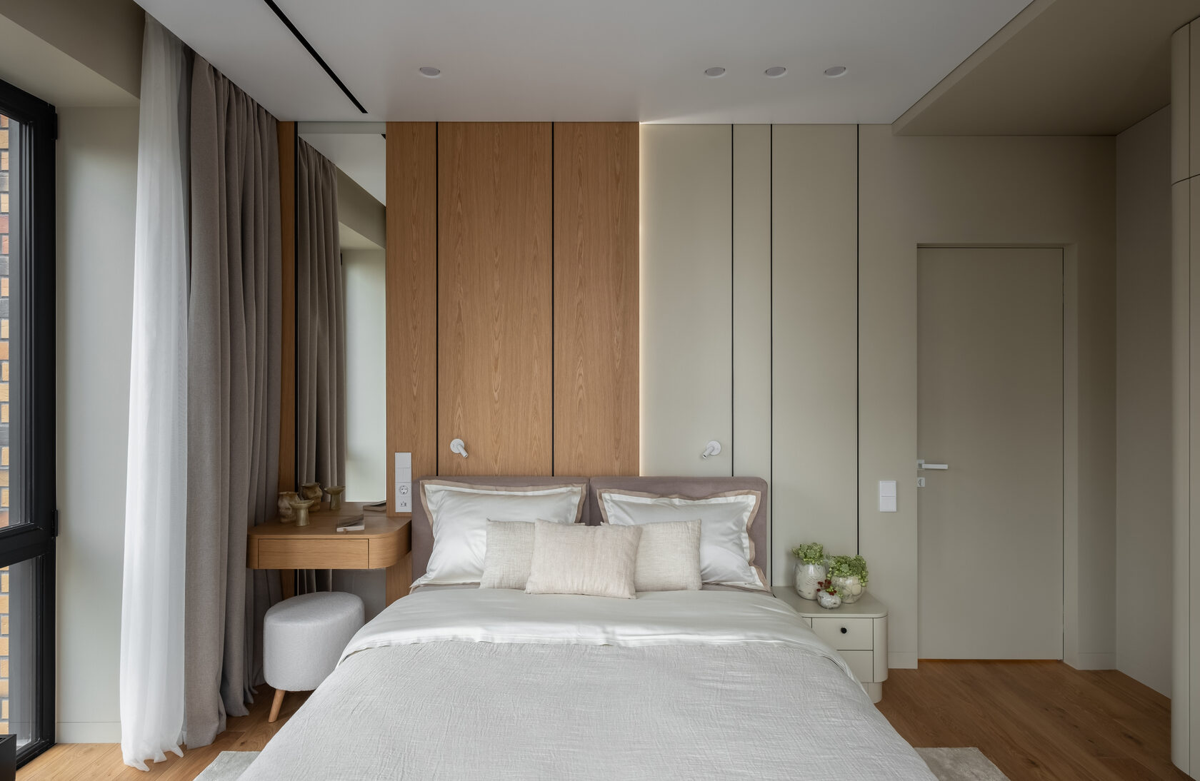 Представленный интерьер спроектирован с учетом потребностей семьи, состоящей из пяти человек: бабушки, родителей и разнополых детей. Этот ансамбль должен не только обеспечивать комфорт, но и создавать атмосферу уюта и тепла, что и достигается благодаря современному стилю оформления, преимущественно выполненному в мягких бежевых тонах. Такие оттенки наполняют пространство светом и спокойствием, вызывая желание проводить время вместе, общаться и делиться моментами друг с другом.