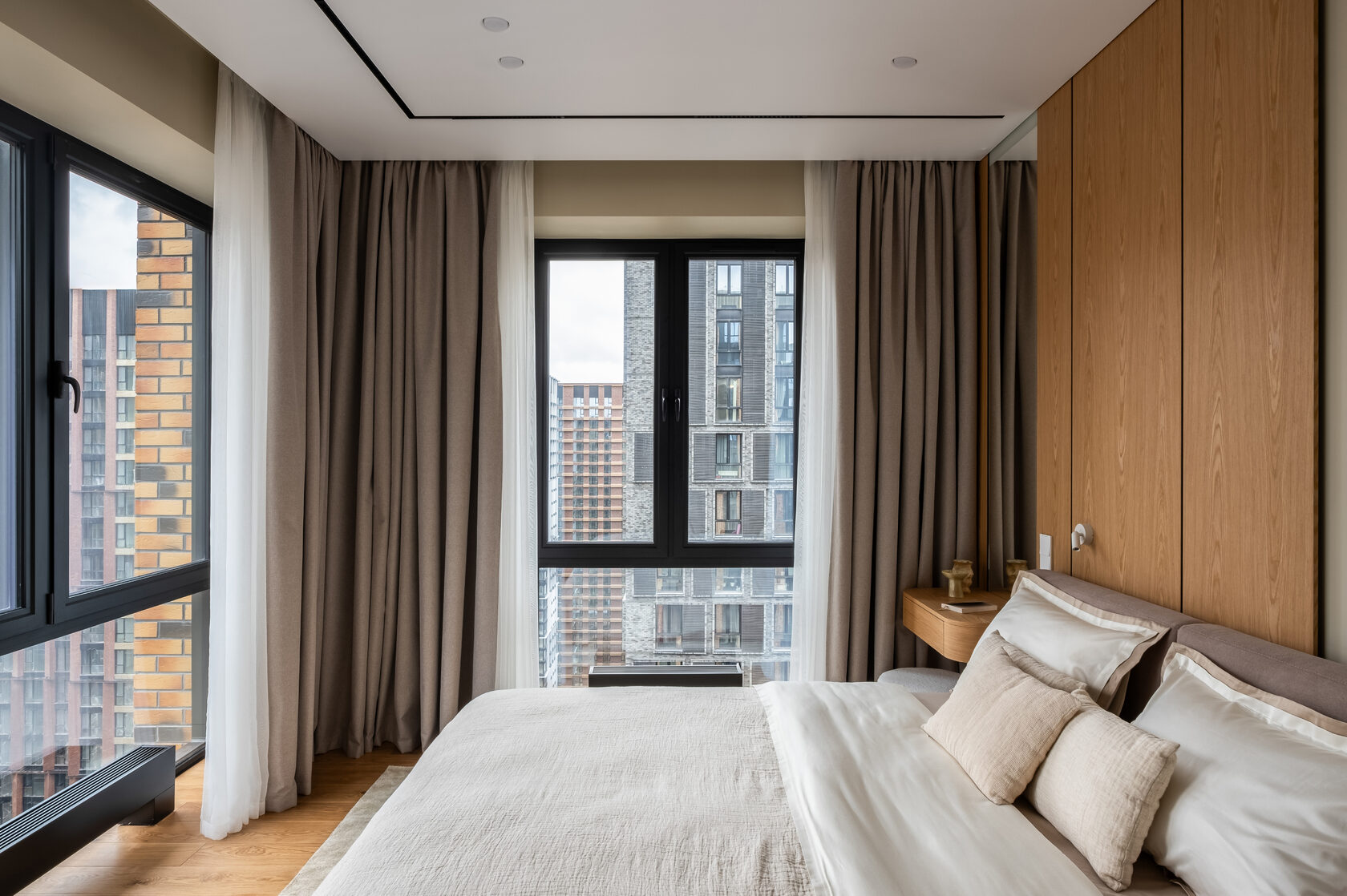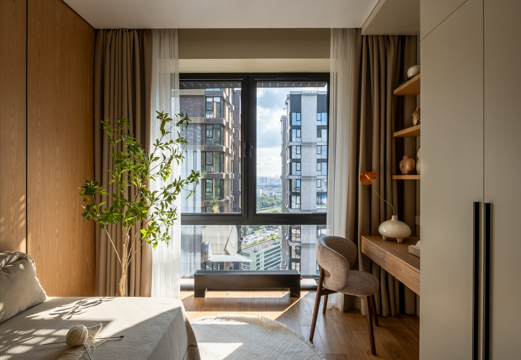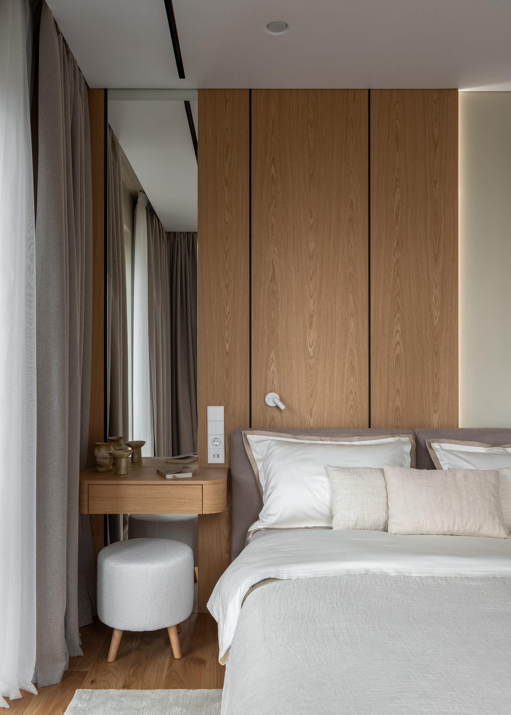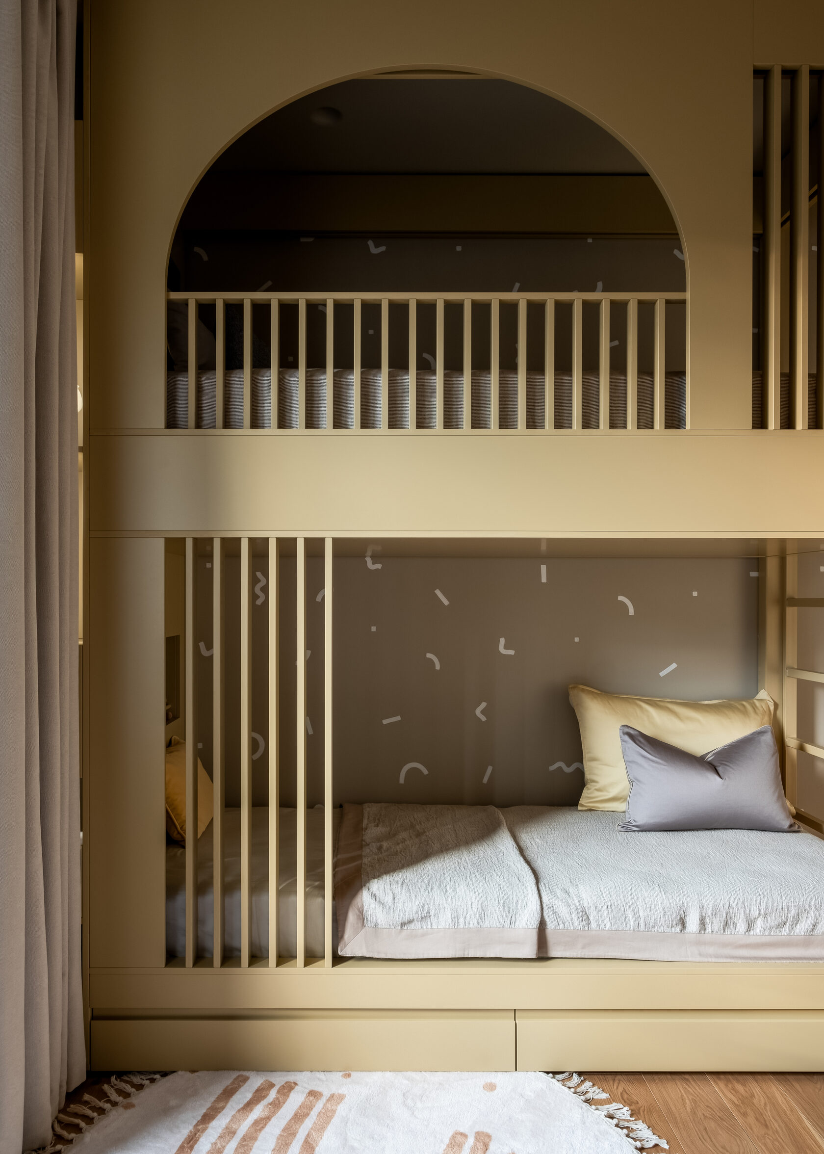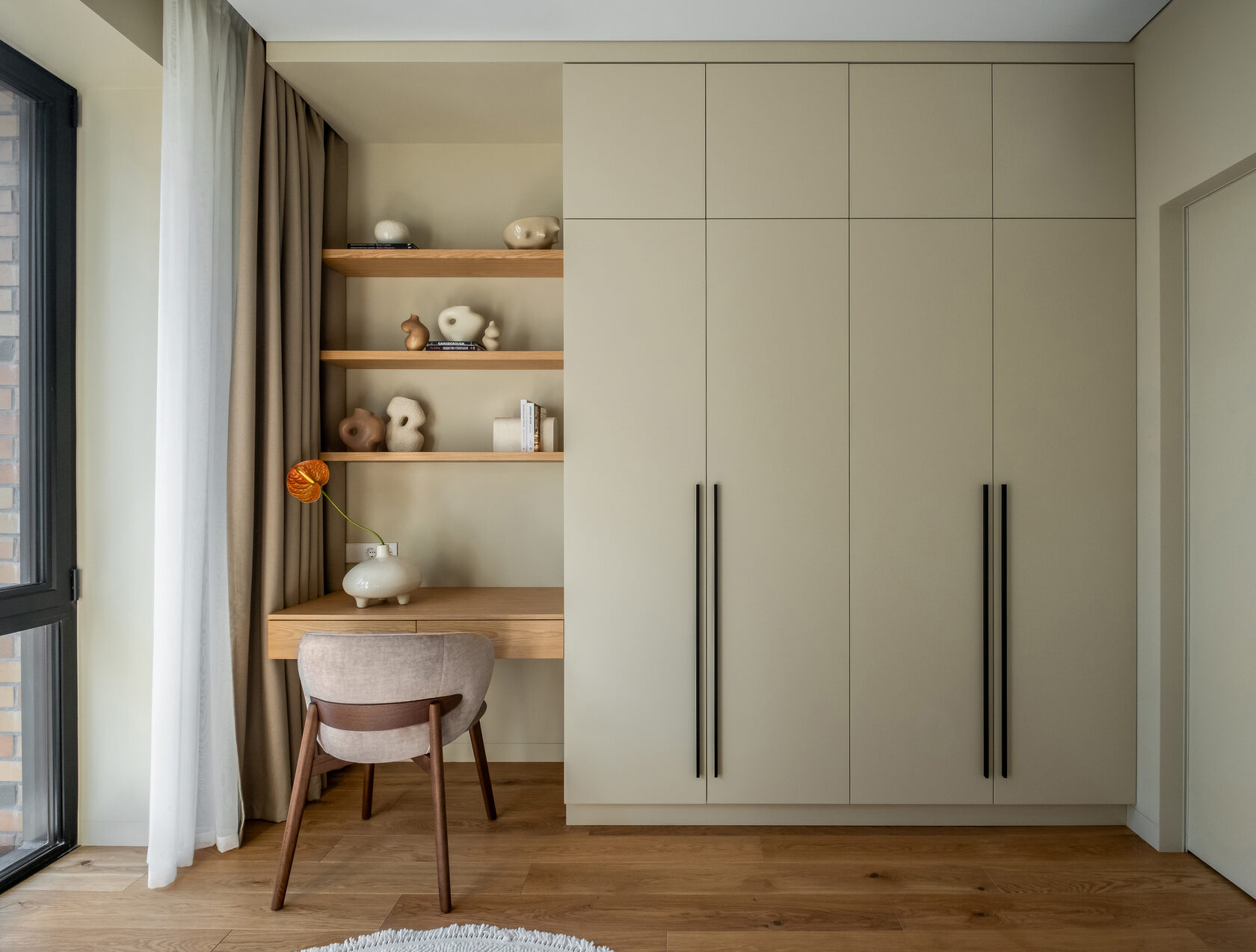 Представленный интерьер спроектирован с учетом потребностей семьи, состоящей из пяти человек: бабушки, родителей и разнополых детей. Этот ансамбль должен не только обеспечивать комфорт, но и создавать атмосферу уюта и тепла, что и достигается благодаря современному стилю оформления, преимущественно выполненному в мягких бежевых тонах. Такие оттенки наполняют пространство светом и спокойствием, вызывая желание проводить время вместе, общаться и делиться моментами друг с другом.